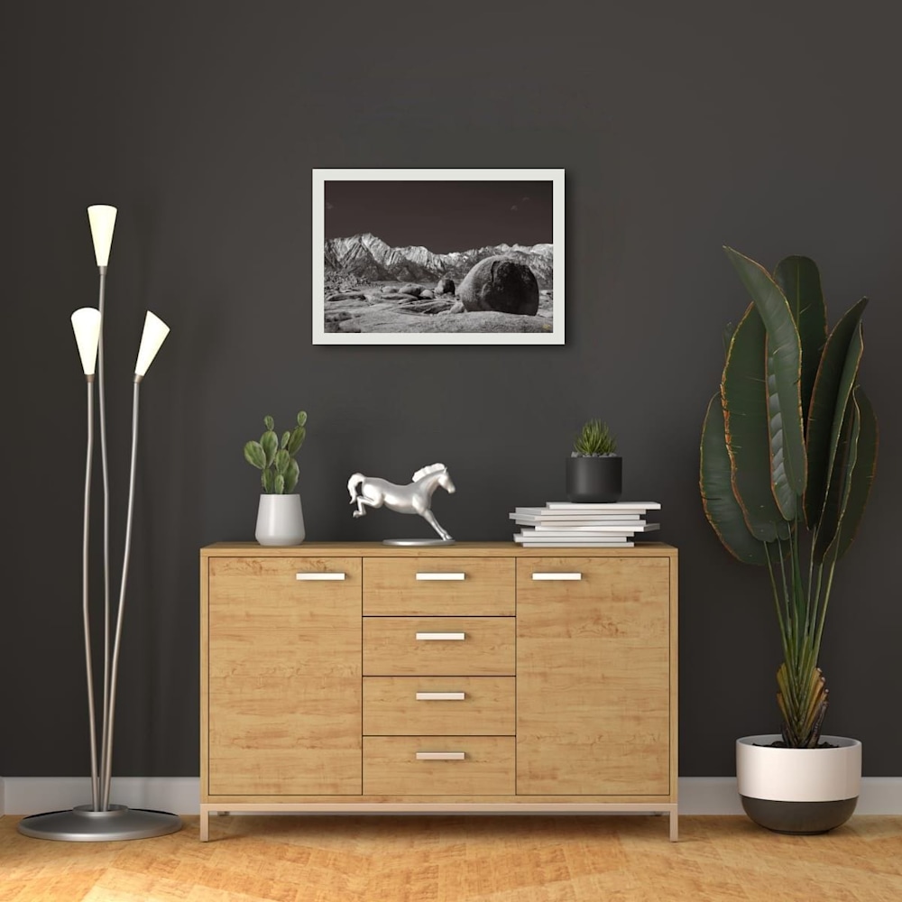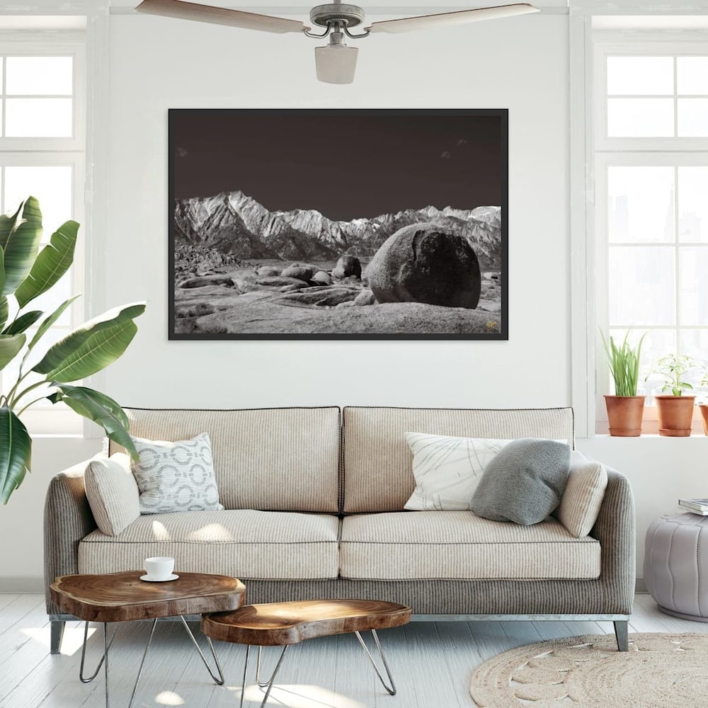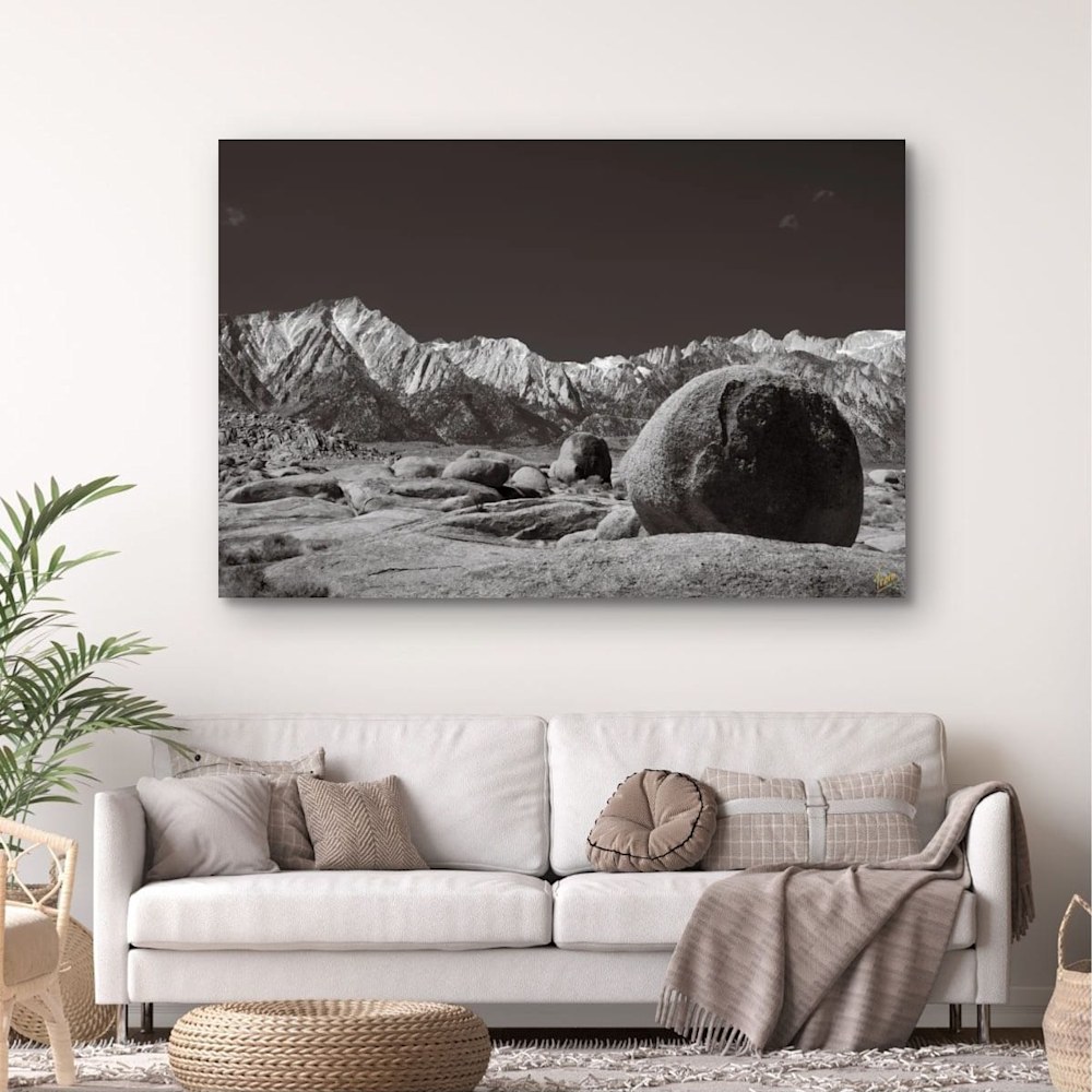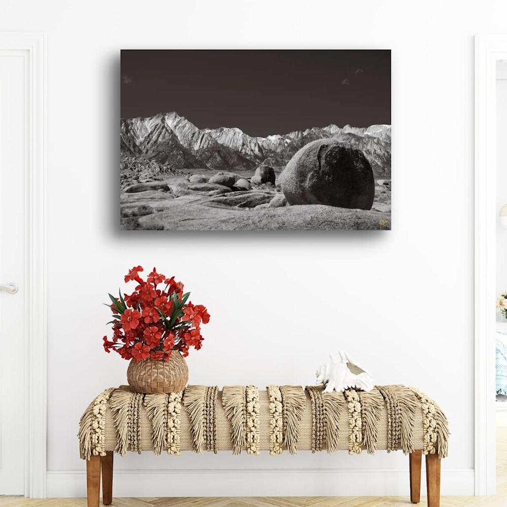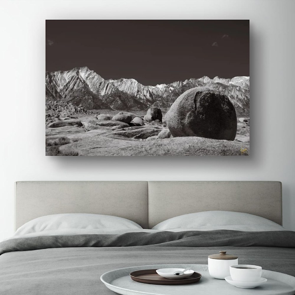 In this image, captured in The Alabama Hills a breathtaking landscape the formidable ridge of the Sierra Nevada Mountains stand out against a stark sky. The interplay of light and shadow on the boulder creates a striking visual contrast. I captured this image late one morning after spending the early morning photographing the early morning light on Mount Whitney. Usually, by mid-morning the light goes rather flat, but this morning these boulders caught my attention. This artwork expresses the untamed beauty of nature, encouraging reflection and admiration for the serene yet powerful spirit of the wilderness. An ideal addition to any space, it invites the great outdoors into your home.
